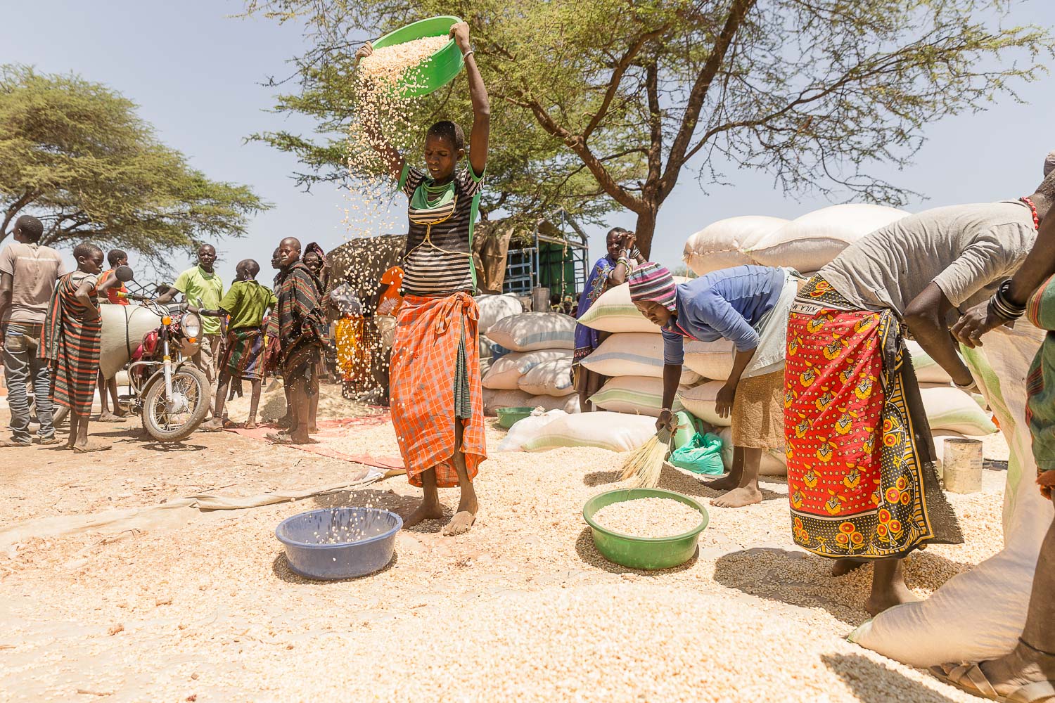 Frauen bei der Verarbeitung von Getreide auf dem Markt in Karamoja, Uganda
