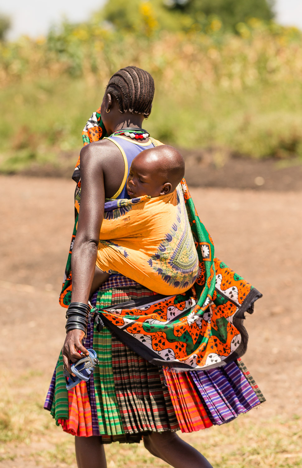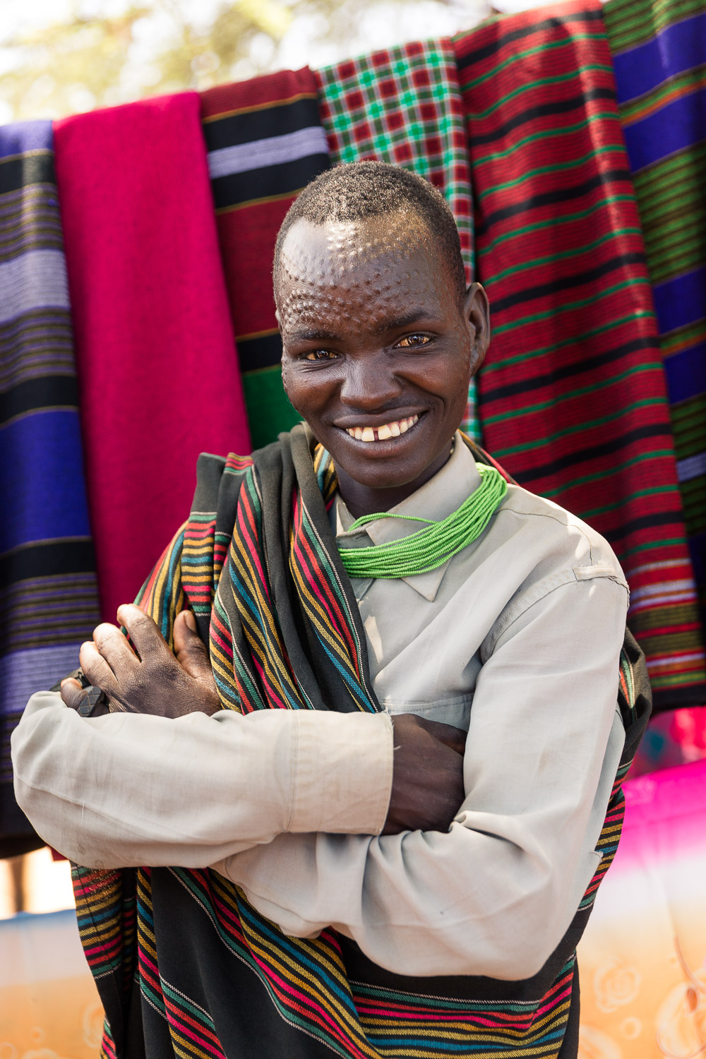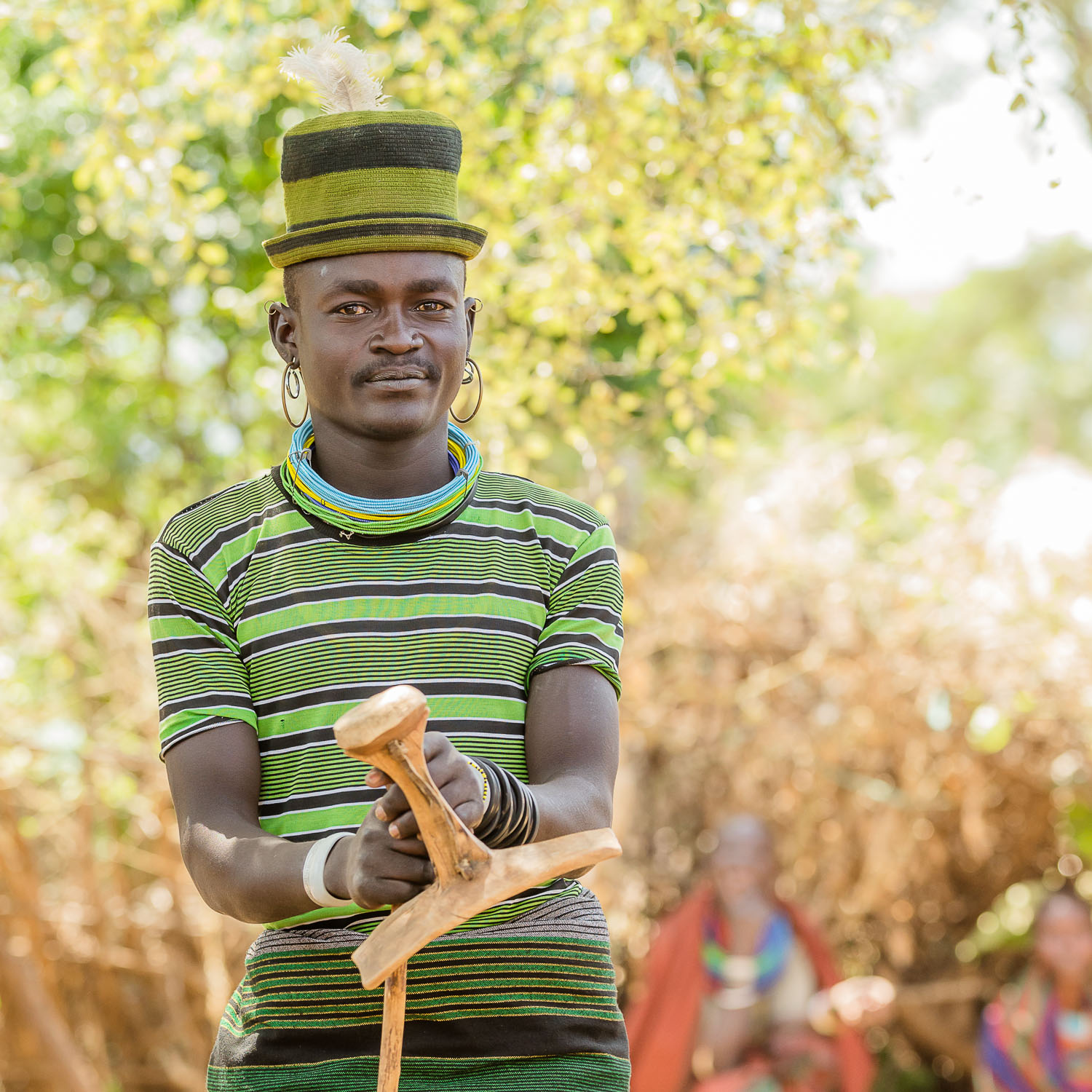 Zur traditionellen Bekleidung der Karamojong gehören bunte Stoffe und Tierhäute von Nutztieren.