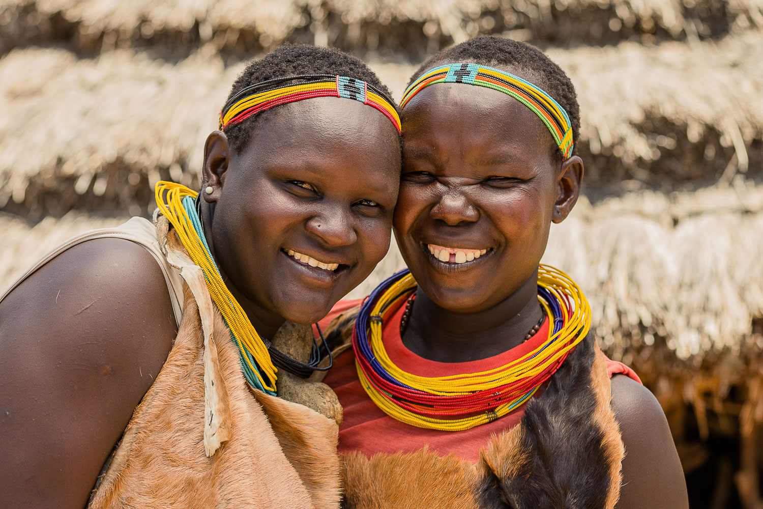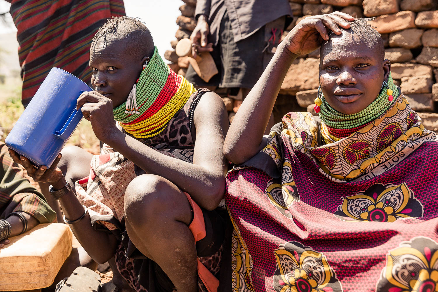 Zwei Karamojong-Frauen mit farbigem Schmuck und traditioneller Kleidung in Karamoja, Uganda