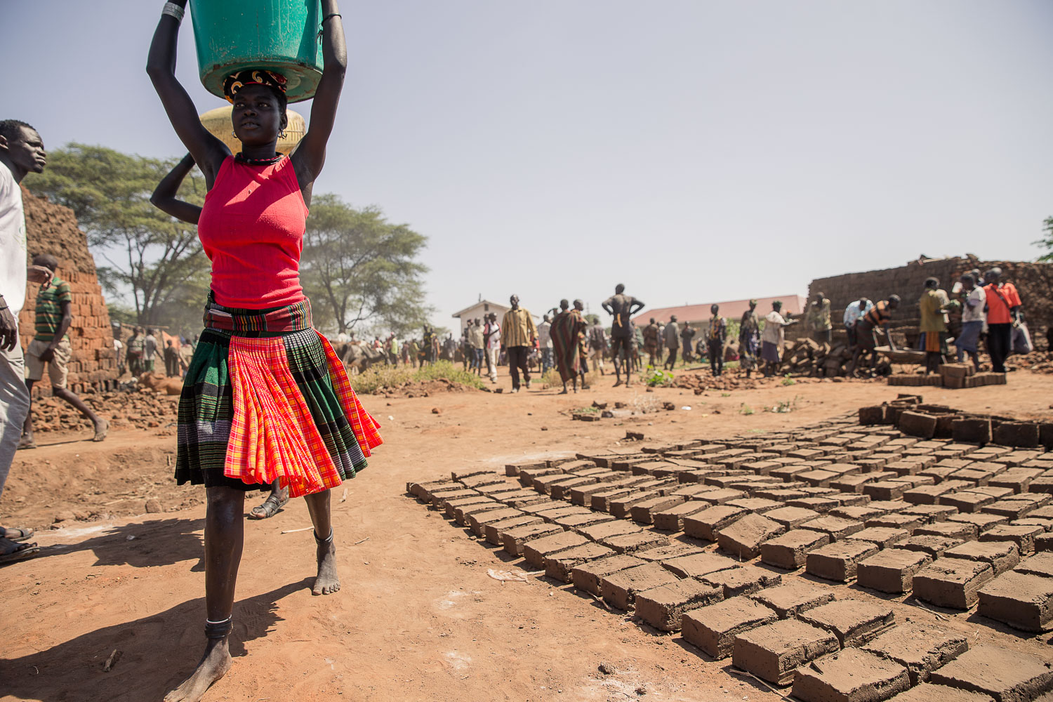 Zwischen Viehmarkt und Alltag: Eine junge Frau trägt einen Wasserbehälter vorbei an frisch geformten Lehmziegeln in Moroto.