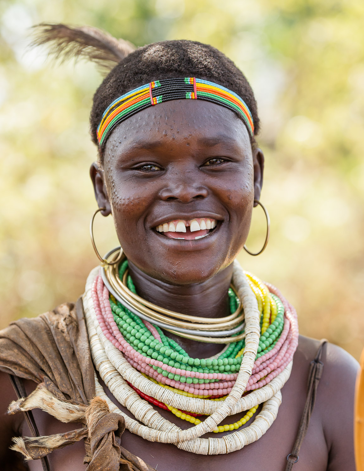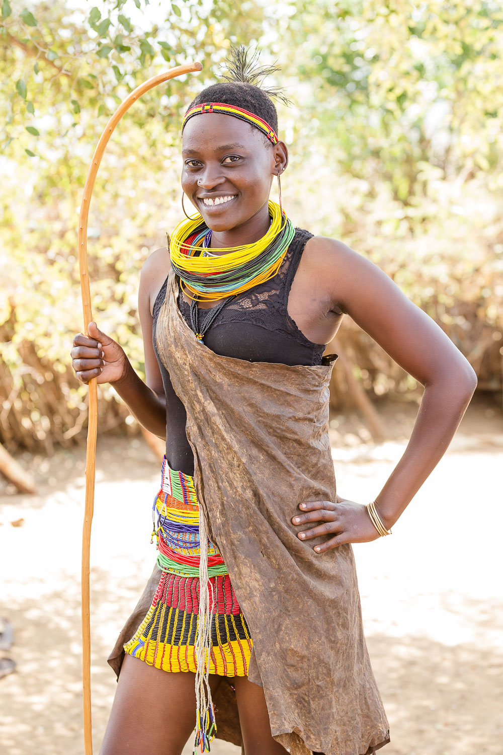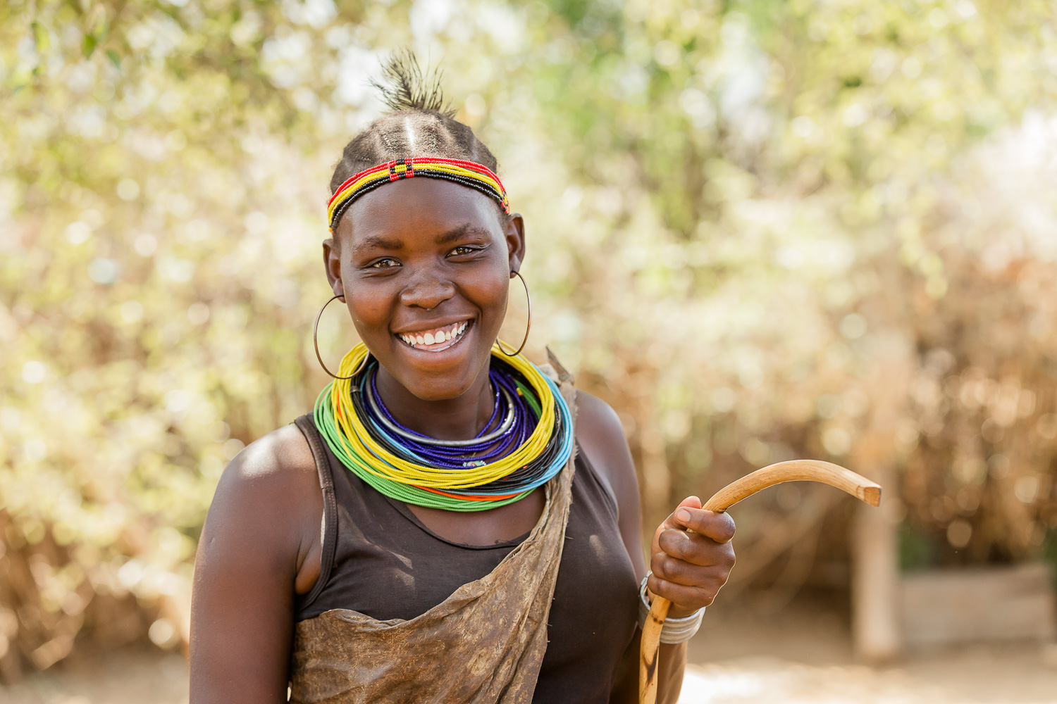 Ziegenhaut, Schmuck und ein offenes Lächeln – Begegnung mit einer jungen Karamojong in Karamoja.