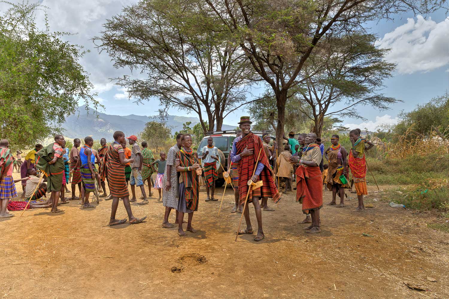 Die Frauen haben knielange bunte Faltenröcke oder Tierhäute um die Hüfte gebunden, die bei jedem Schritt dekorativ wippen, dazu jede Menge Schmuck. Bunte Ketten schmücken Hals und Arme und verraten einiges über den gesellschaftlichen Stand.