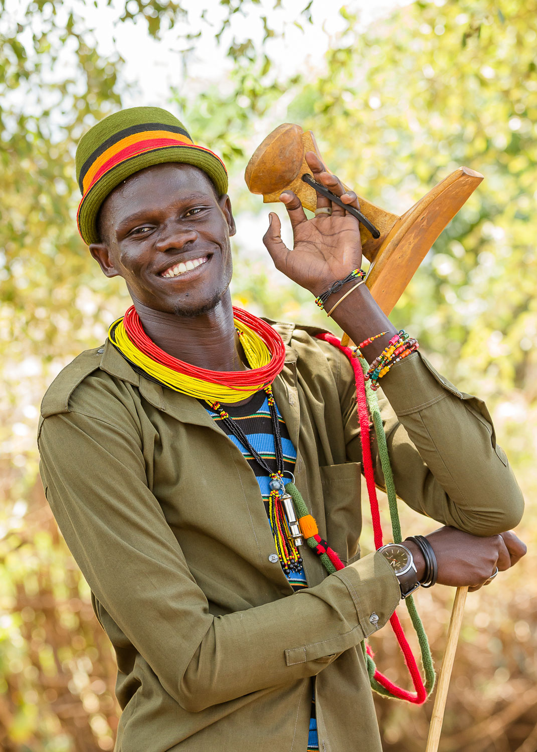 Die Karamojong haben eine starke visuelle Kultur. Die Männer tragen farbige Umhänge und kleine Hüte, die je nach Status und Möglichkeiten aus Wolle oder menschlichem Haar gefertigt werden. Auch militärisch anmutende Kleidung wird gerne genommen, schließlich waren die Karamojong über Jahrhunderte ein kämpferisches Volk. Federn am Hut geben Auskunft über Status oder Stand, eine weiße Feder am Hut symbolisiert: Ich bin noch Single!