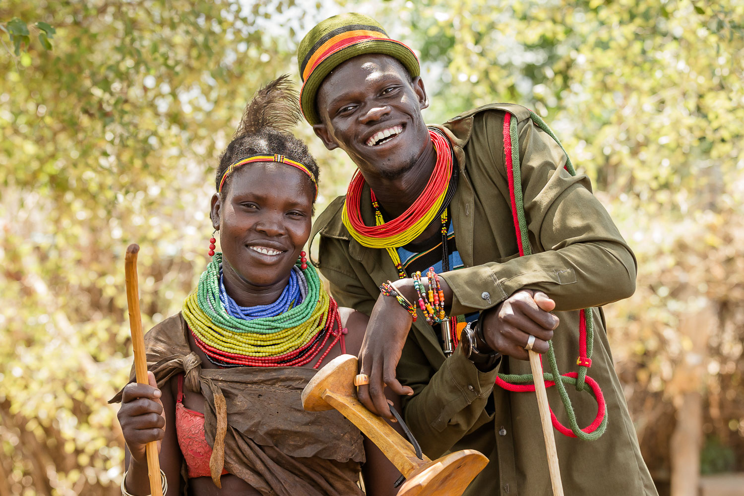 Karamojong-Paar mit Schmuck und traditioneller Kleidung