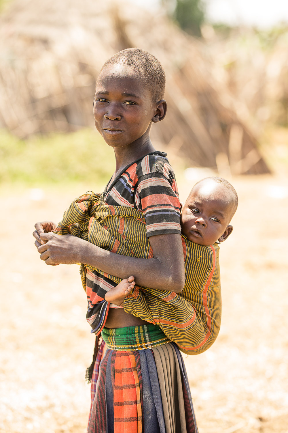 Mädchen der Karamojong mit einem Baby auf dem Rücken in Karamoja, Uganda