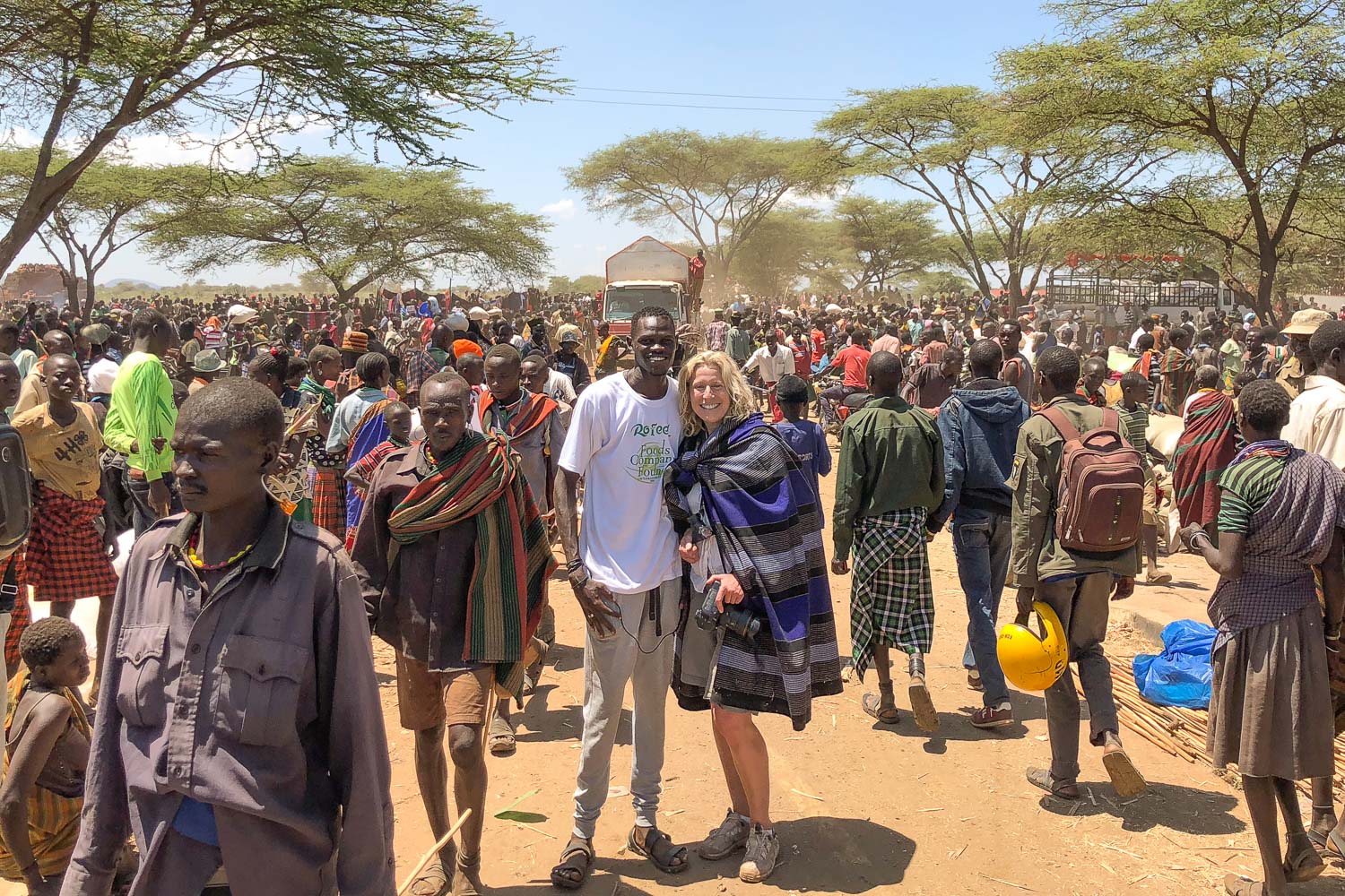 Mit Karamojong-Umhang mitten im Marktgeschehen von Moroto: Gemeinsam mit ihrem einheimischen Begleiter Julius fand Fotografin Radmila Dier schnell Zugang zu den Menschen vor Ort.