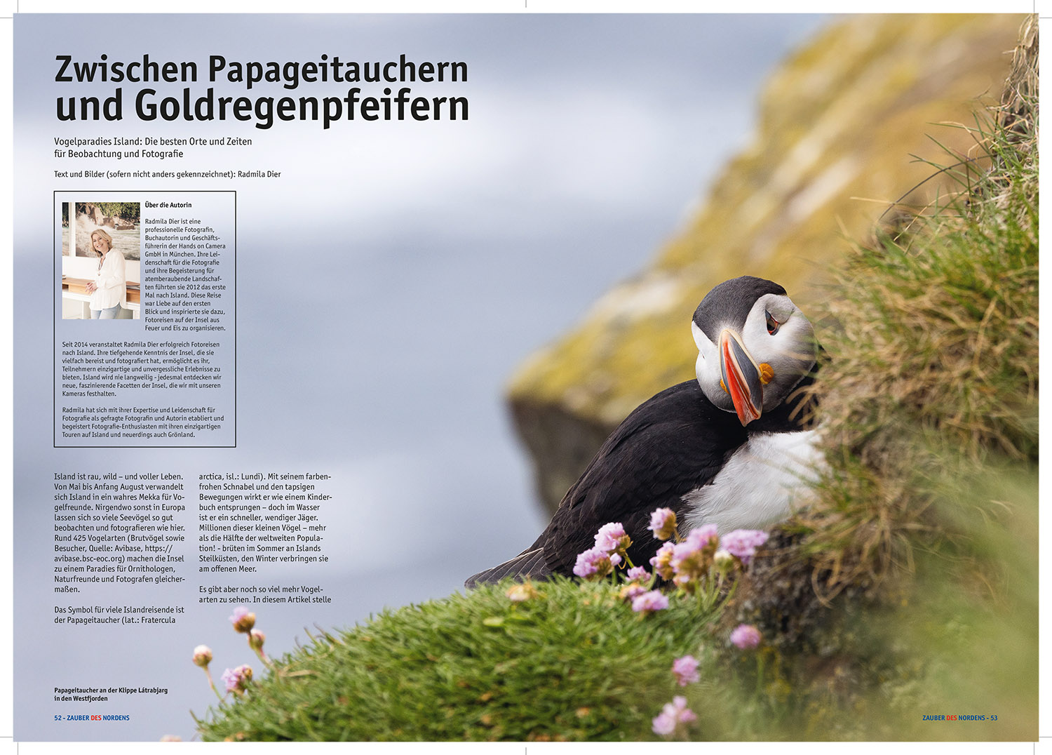 In der Ausgabe 2025-2 von Zauber des Nordens ist der Artikel „Zwischen Papageitauchern und Goldregenpfeifern“erschienen. Darin geht es um Island als Vogelparadies, um die besten Orte und Zeiten für Vogelbeobachtung und Fotografie sowie um ausgewählte Regionen rund um die Insel – von Reykjavík bis zu den Westfjorden.