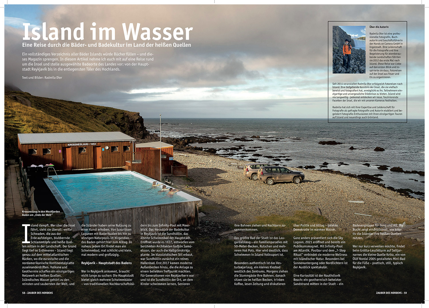In der Ausgabe 2026-1 von Zauber des Nordens ist der Artikel „Island im Wasser“ erschienen. Darin geht es um die Bade- und Badekultur Islands, um ausgewählte Bäder und heiße Quellen rund um die Insel sowie um die besondere Rolle des Badens im isländischen Alltag und Lebensgefühl.